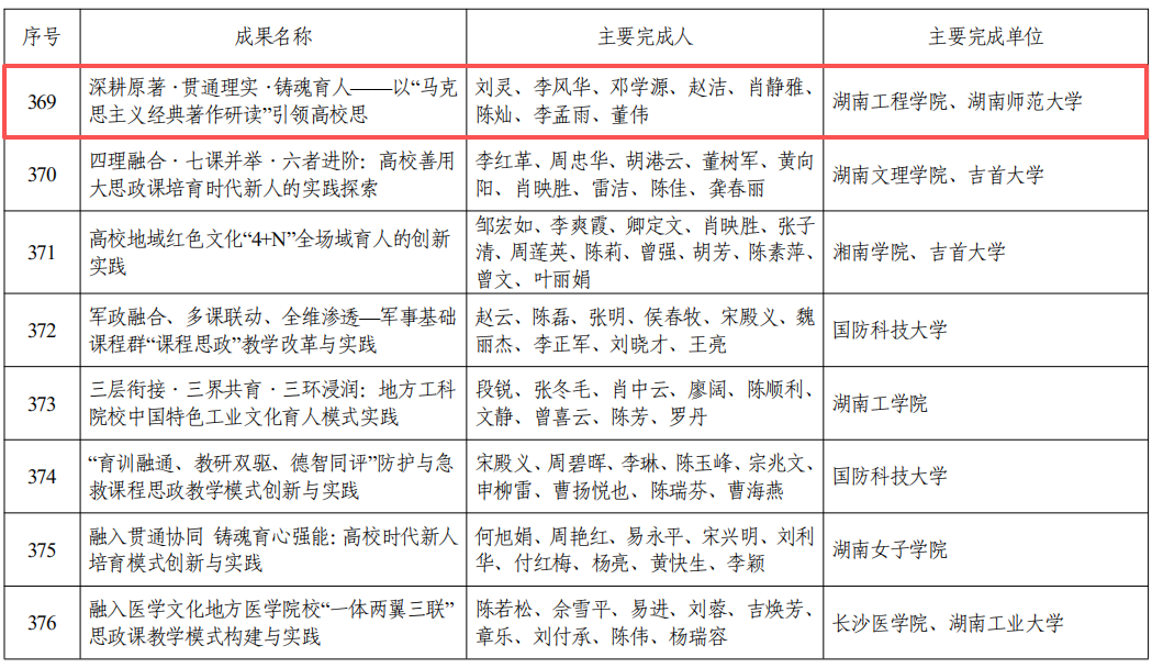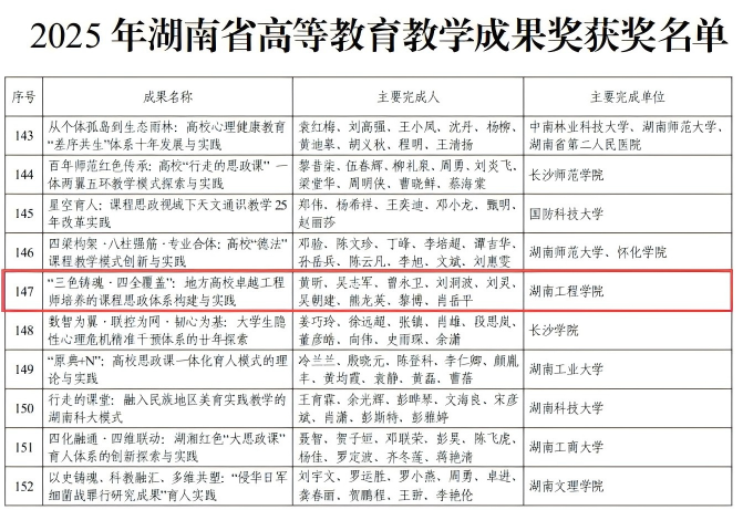 近日,湖南省教育厅公布了2025年高等公司产品成果奖获奖名单。黄昕教授领衔团队的《“三色铸魂·四全覆盖”:地方高校卓越工程师培养的课程思政体系构建与实践》(序号147)获一等奖;刘灵教授领衔团队的《深耕原著·贯通理实·铸魂育人—以“马克思主义经典著作研读”引领高校思政“金课”建设与探索》(序号369)获二等奖。