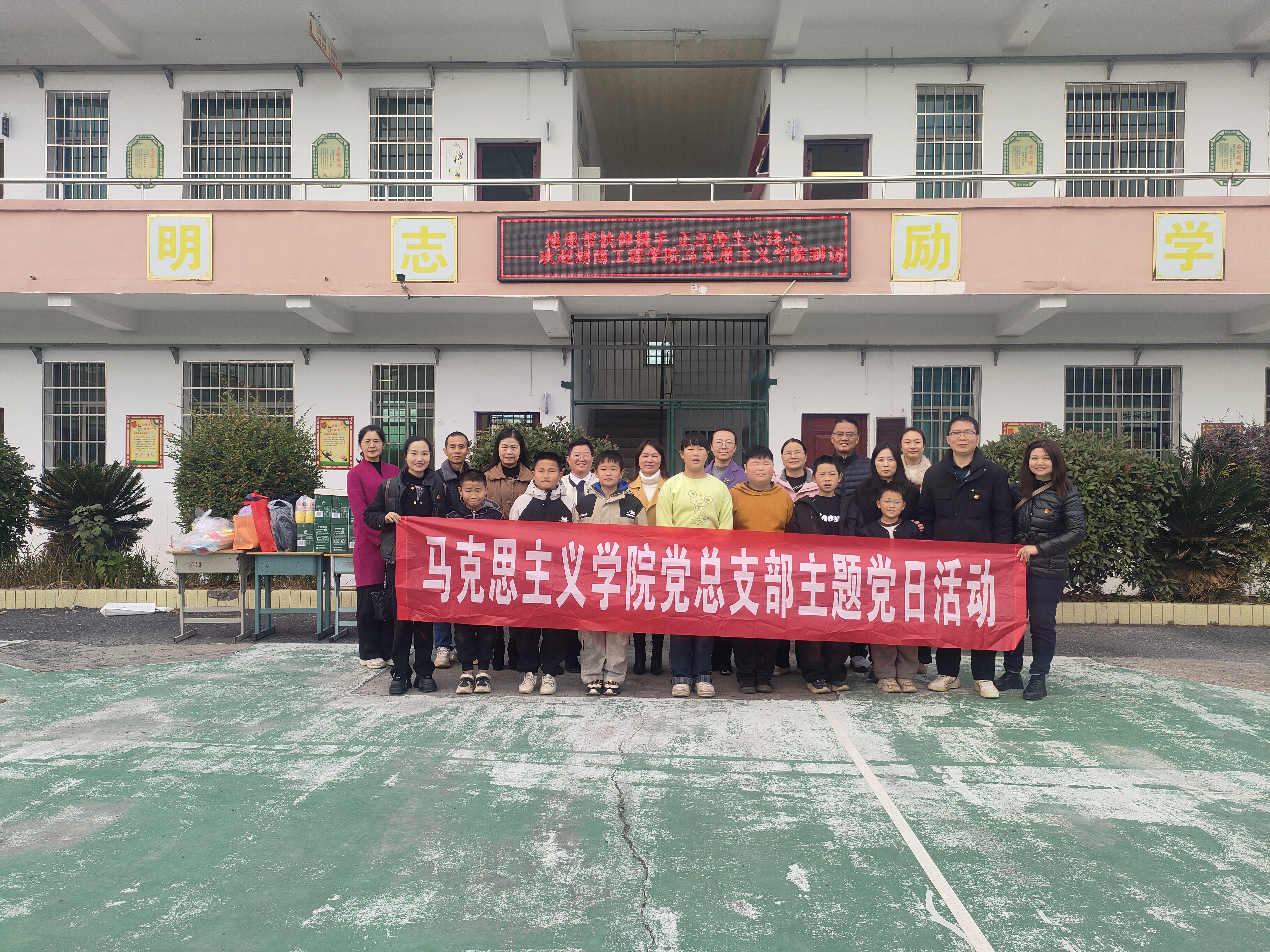 12月18日,冬日的微风裹着几分凉意,却吹不散岳塘区荷塘乡正江完小里融融暖意。beats365教工党员代表为这所仅有七名员工、五位教师的乡村小学,带来了一场满载关怀的“情暖冬日 爱满人间”主题党日捐赠活动。