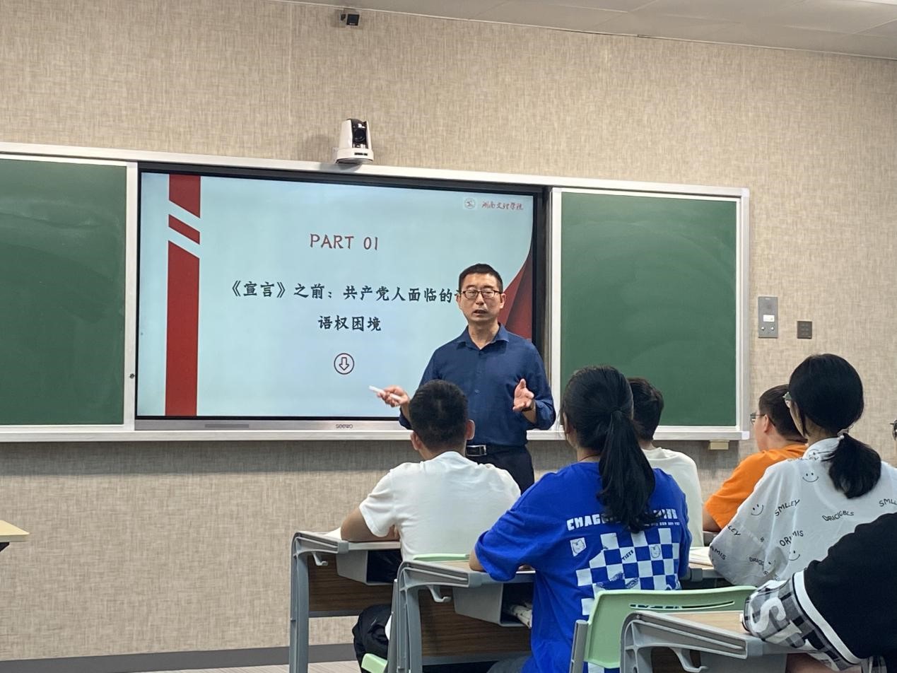 为深入贯彻落实《关于做好2022年湖南省社科普及工作的通知》精神,结合公司省级一流本科课程建设需要,9月23日下午,beats365“听名师 讲原著 悟原理”专题讲座在新校区教学楼A座502举行,本次讲座邀请湖南文理公司beats365经理黄向阳主讲,讲座题目为“共产党人的话语权斗争:从《宣言》到当代”为主题,讲座由beats365副经理刘灵主持。